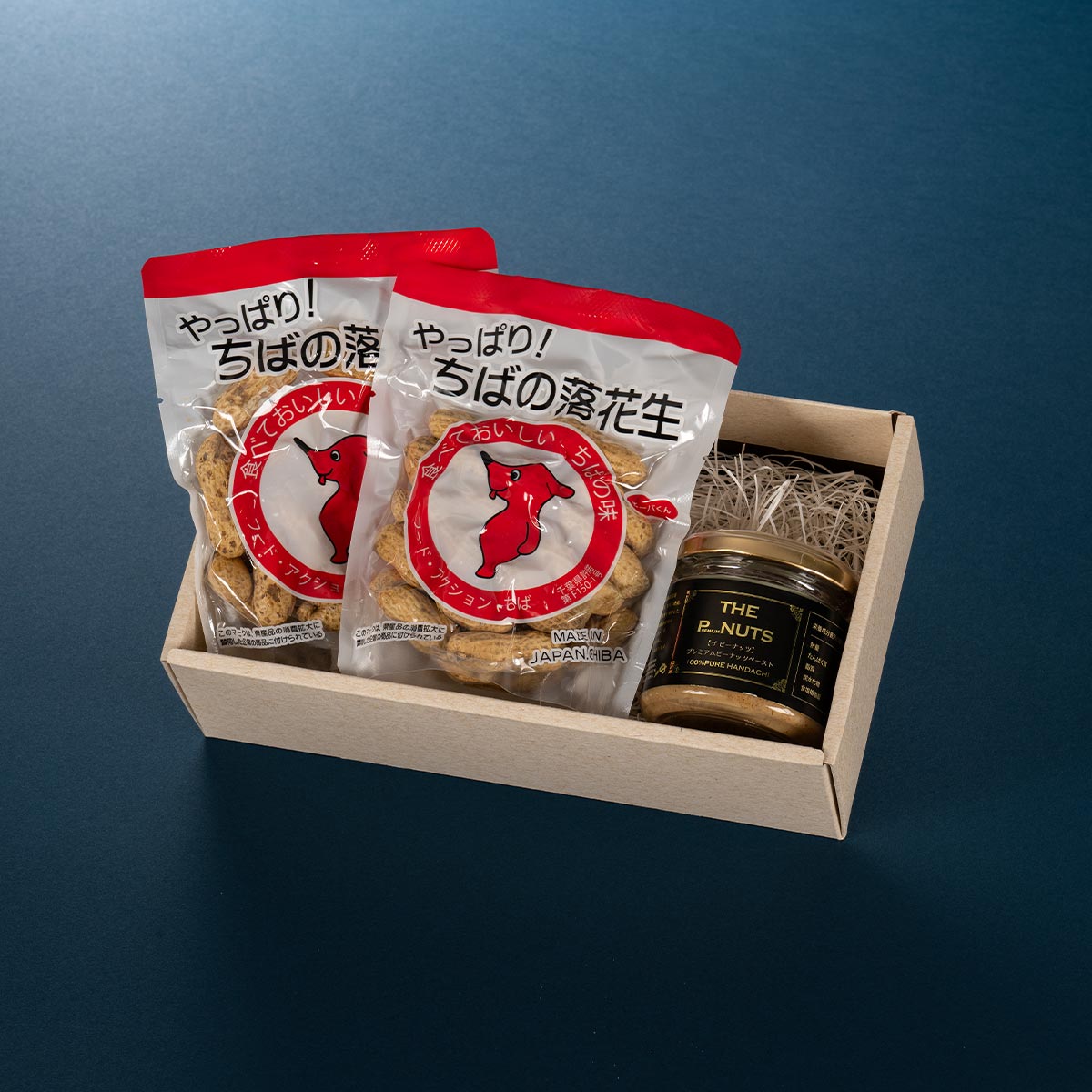 千葉県産最高級品種【千葉半立ち種】を使用したピーナッツペースト【THE P-NUTS】 プレミアムピーナッツペースト1個と、千葉県のマスコットキャラクター、チーバくんのパッケージに入った食べきりサイズの千葉半立ち種の殻付き落花生60g×2Pをセットにしてお届けします。